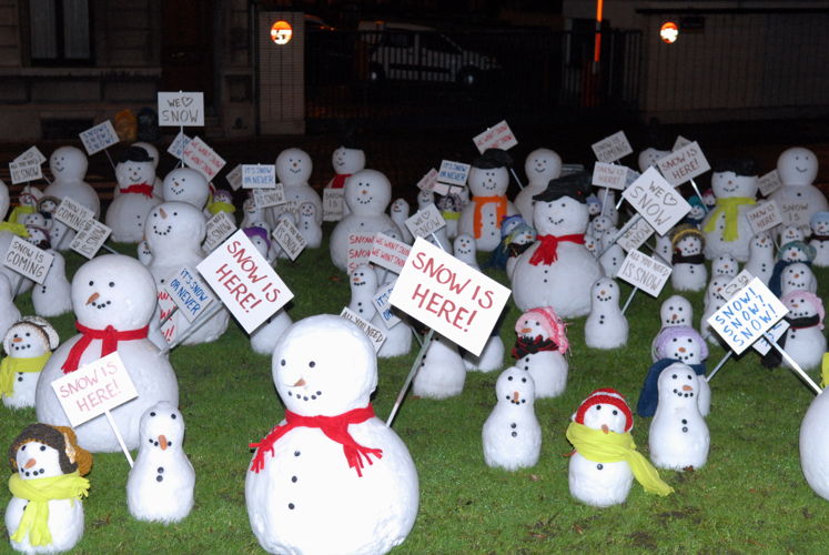Honderden sneeuwmannetjes roepen om SNOW voor hoofdkantoren Telenet, Belgacom en VOO